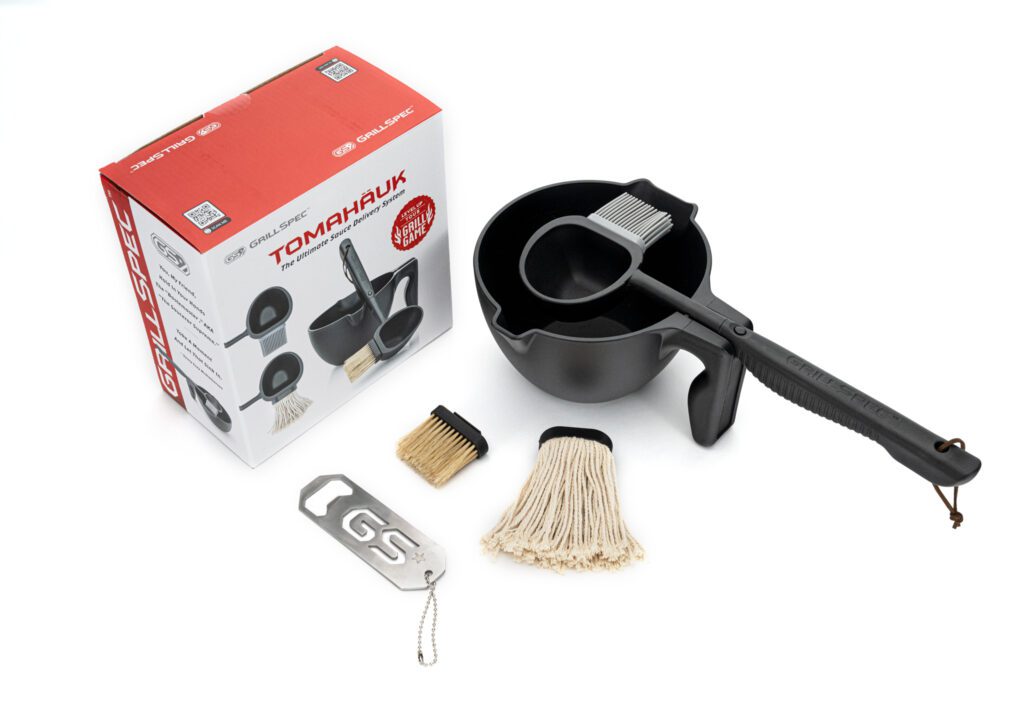 Save space & time with the Tomahäuk Ultimate Sauce Delivery System by GrillSpec. Large ladle & included sauce cup. Mop Brush to baste large proteins. Boar Bristle brush for medium-sized proteins/thin sauces. Silicone Brush for smaller proteins/thick sauces. Stainless steel bottle opener included.